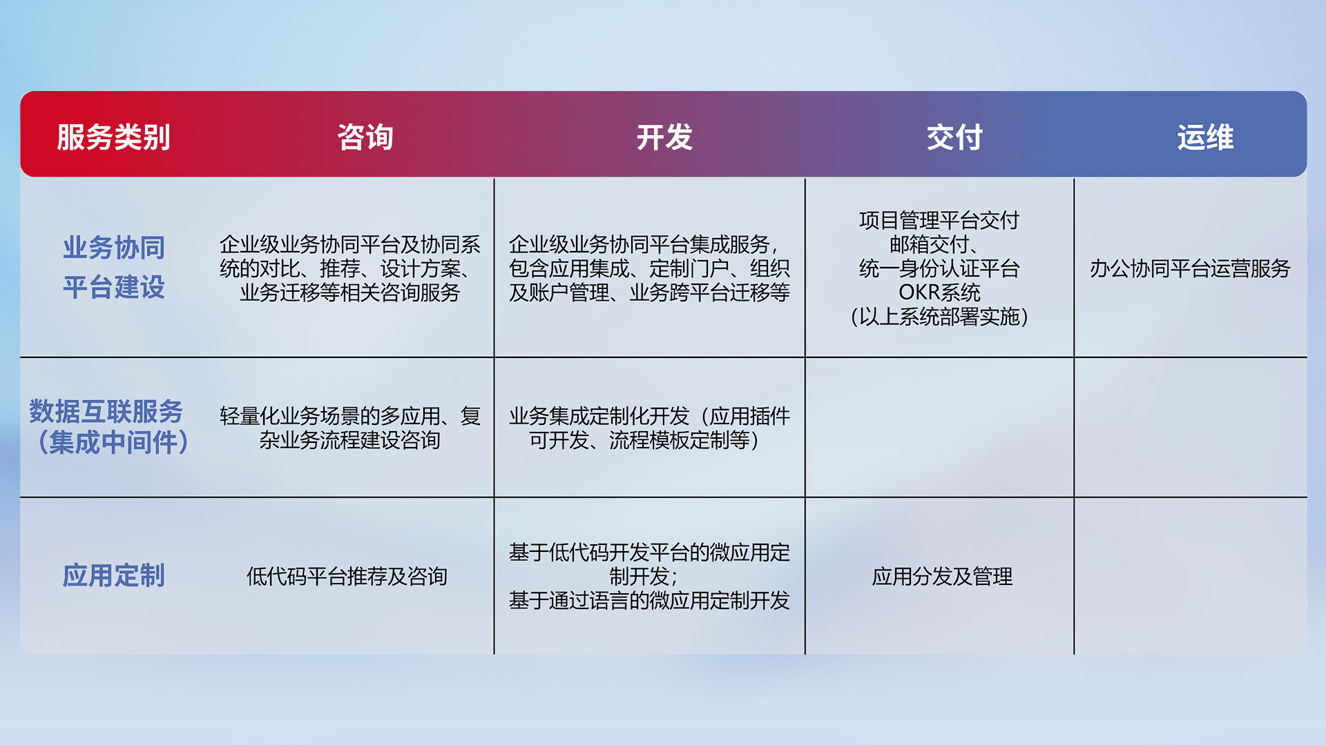 针对钉钉、、、企微、、、、IDaas等平台级产品提供产品的规划、、、方案、、、、交付、、定制化开发等服务,,实现如统一协同办公、、智能客户服务、、混合会议管理、、、、智能数据查询、、等业务场景,,,,实现数字化转型。。。